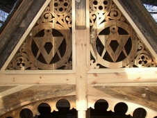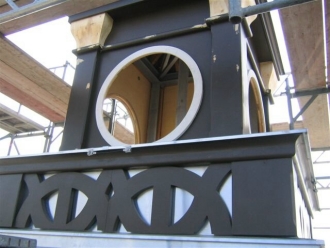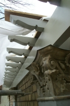 Schmuckkonsolen wurden in der Werkstatt aus Kiefernstammware vorgefertigt. Zur Erschließung der Turmstube wurde eine ½-gewendelte