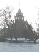 einen unregelmäßigen Umriss, einen bekrönenden hohen Turm mit Turmhelm,