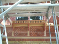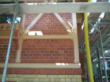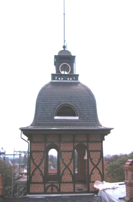 Entwurfsskizzen und Mustern entworfen. Die sichtbare mit Klinkern ausgefachte Fachwerkkonstruktion besteht aus Brettschichtholz. Für die Neuherstellung der Turmkonstruktion wurde „Märkische Kiefer“ verzimmert. Der umlaufende Profilgesimskasten sowie die