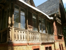 stammen. Eine Backstein-Holz-Architektur mit reichen Laubsägedekorationen,